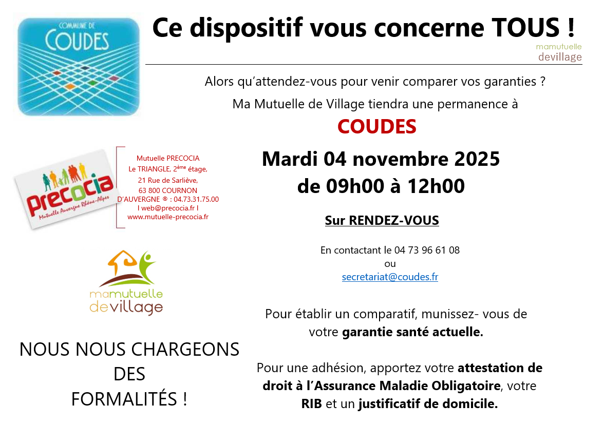 Permanence Mutuelle de village Précocia en mairie le mardi 04 novembre de 9h00 à 12h00, sur rdv auprès du secrétariat de mairie : 04 73 96 61 08 ou secretariat@coudes.fr
