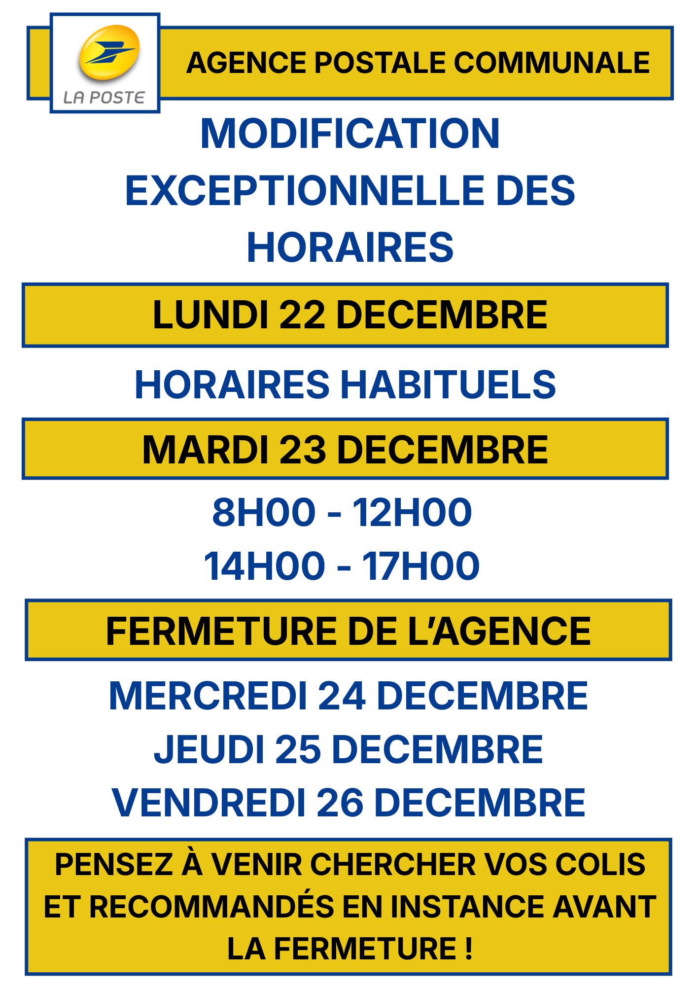 Pour vous permettre de réaliser vos retraits d'argent (dépannage financier) et de récupérer vos colis et recommandés en instance, l'Agence Postale Communale sera exceptionnellement ouverte TOUTE LA JOURNÉE le mardi 23 décembre.
